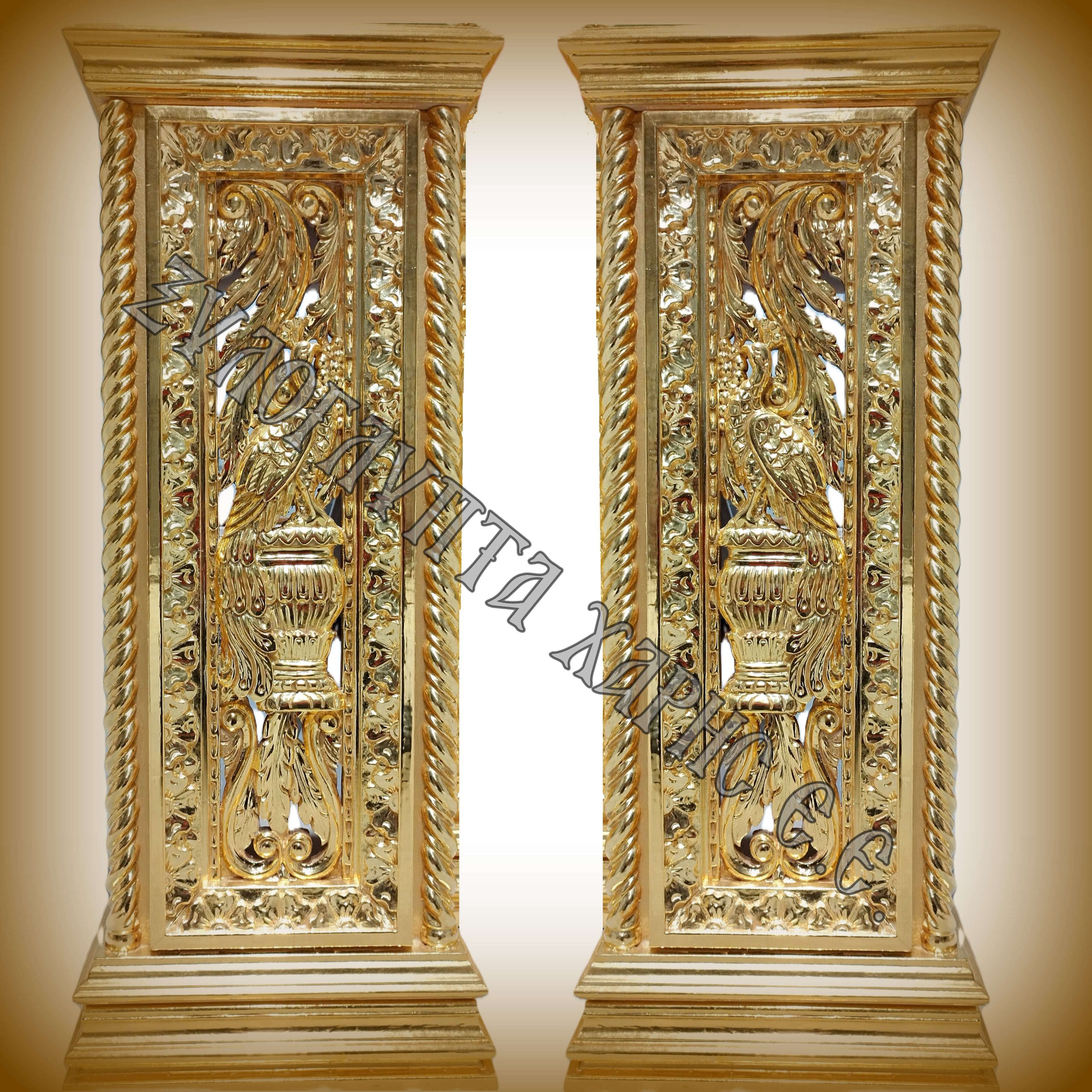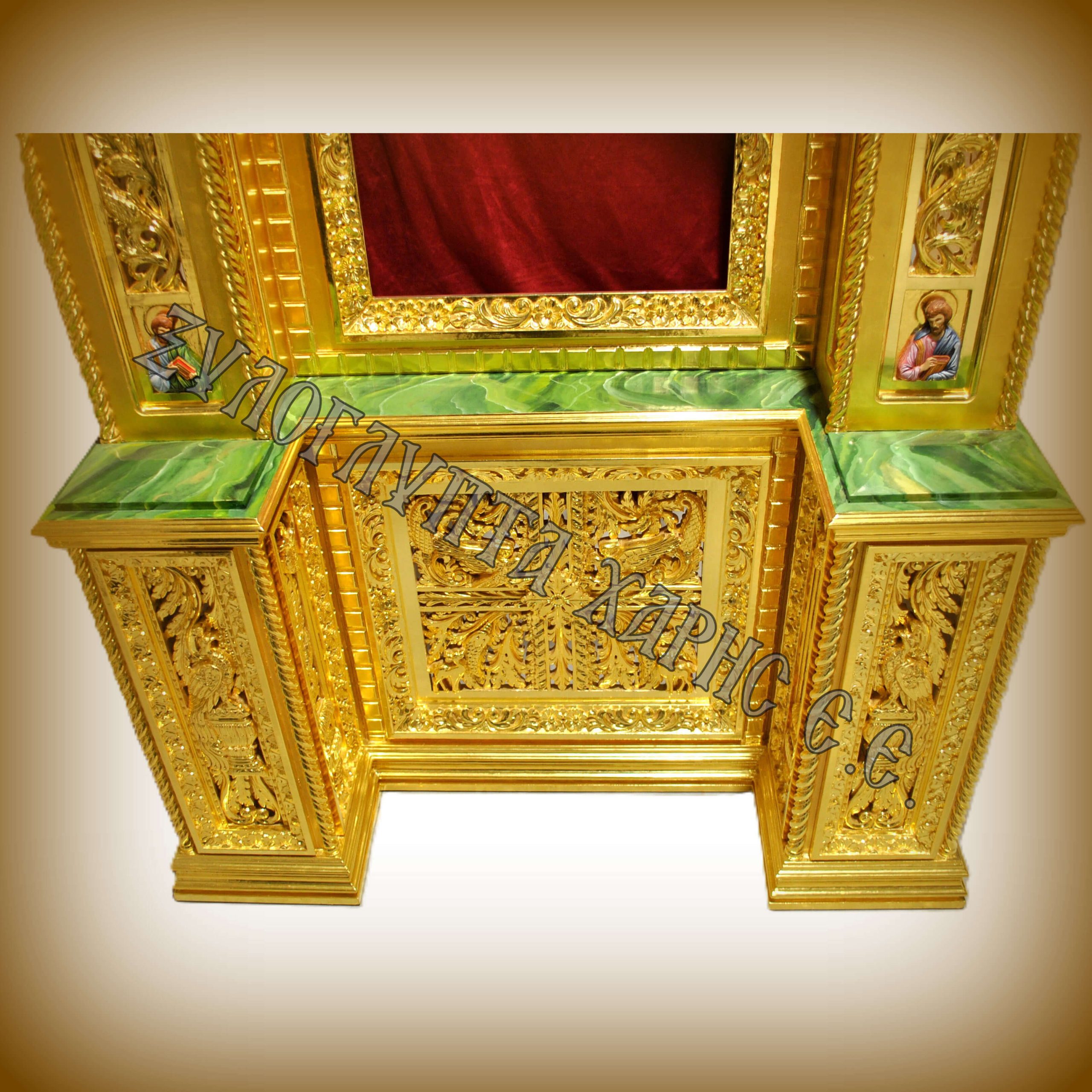 Ξυλόγλυπτο προσκυνητάρι με στιλβωτό χρυσό 24 καρατιών και λευκόχρυσο [πλατίνα] με αγιογραφίες και δεύτερη επιλογή με μόνο χρυσό 24 καρατιών.